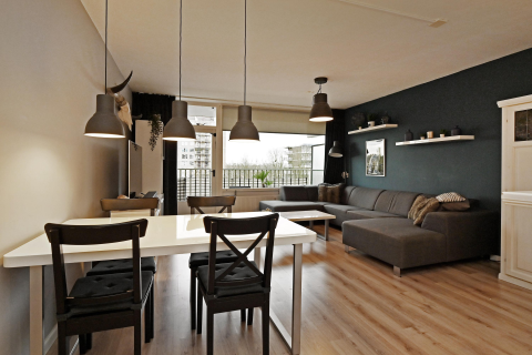 De woonkamer van circa 23m² heeft grote raampartijen, voor extra lichtinval en biedt een goed uitzicht op de achtertuin, welke je via een schuifpui uit de woonkamer kan bereiken.